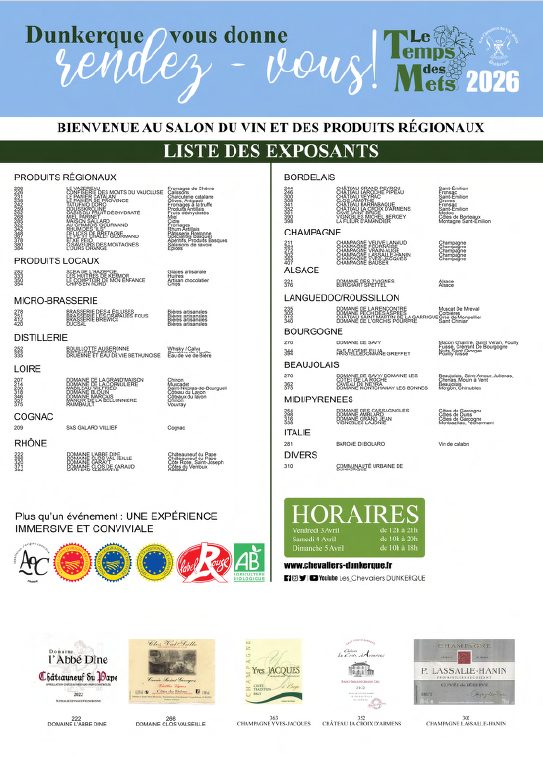 b9026d81ba4bf1138bef1fef2caea1fb Administrateur a écrit un nouvel article https://accueil.chevaliers-dunkerque.fr/?p=26015 Tue, 15 Mar 2022 18:09:46 +0100 A vos agendas! Dès à présent, bloquez votre week-end du 3 au 5 avril 2026 pour venir retrouver nos exposants (vignerons, brasseurs, producteurs et ar […]
