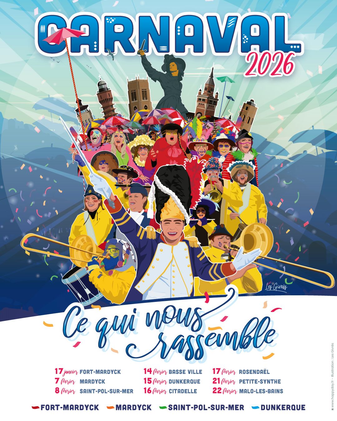 3dece0b0845816a30c03402cc833b0f4 Administrateur a écrit un nouvel article https://accueil.chevaliers-dunkerque.fr/?p=88664 Thu, 23 Jan 2025 18:10:57 +0100 Affiche du Carnaval 2026 L’affiche de cette année représente le tambour-major devant des musiciens en cirés jaunes et une bande de carnavaleux. En arri […]